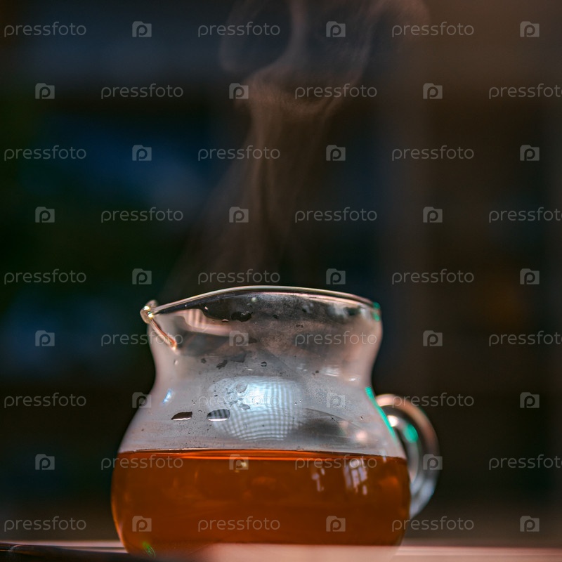 Красивый стеклянный кувшин, наполненный растущим травяным чаем, излучающим привлекательные ароматы и тепло