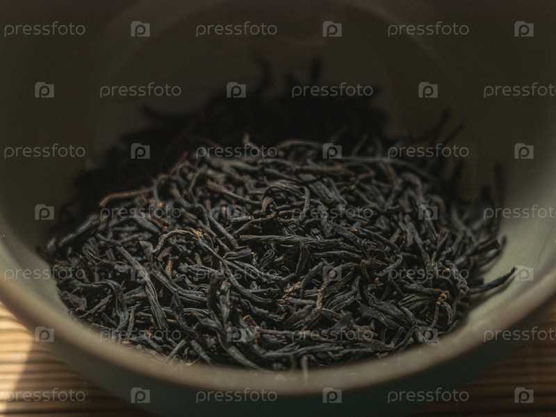 Этот детальный крупный план ароматических сушеных листьев черного чая, представленных в деревенской миске, идеально подходит для любителей чая