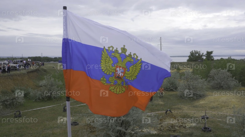 Российский флаг развевается на ветре на фоне гор и природы.Возвещается российский флаг.Флаги России на 4K фоне