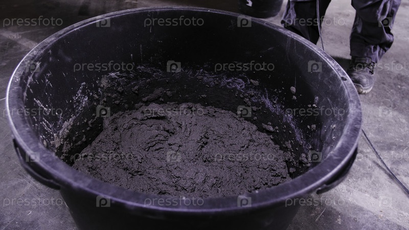 Рабочий смешивает цемент в контейнере. резервные кадры. Мужчина перемешивает строительный цемент на стройке