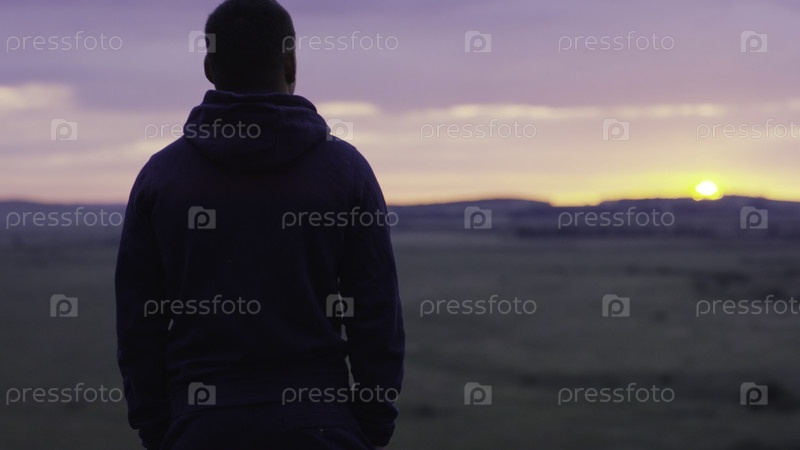Успешный человек смотрит на заходящее небо, чтобы отпраздновать свободу. положительные человеческие эмоции, ощущение успеха в жизни, концепция душевного спокойствия. свободный счастливый человек
