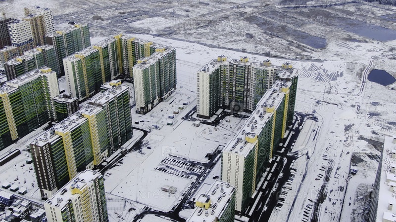 Современный район с многоэтажными комплексами зимой. Движение. Вид на красивую ландшафтную зону с жилыми красочными зданиями зимой. Панорама зимнего жилого района
