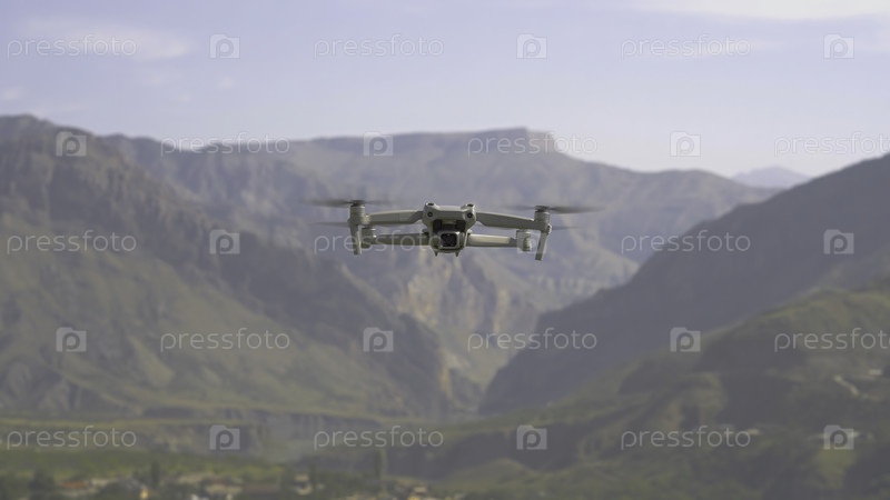 Квадрокоптер летает на фоне гор. Продолжайте. Вид квадрокоптера, летящего в воздухе на фоне гор. Quadcopter фотографирует горные пейзажи в солнечный день
