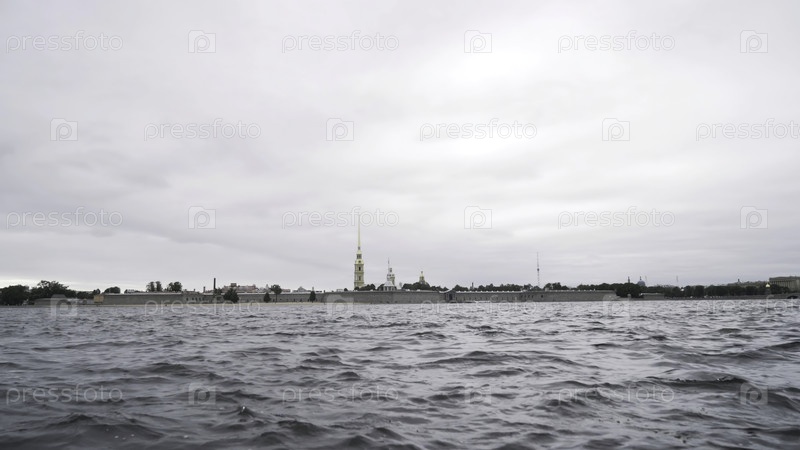 Крепость Петра и Павла и река Нева. продолжайте. Санкт-Петербург, Россия, закрывает раздраженную поверхность воды реки, а крепость находится далеко на фоне облачного неба
