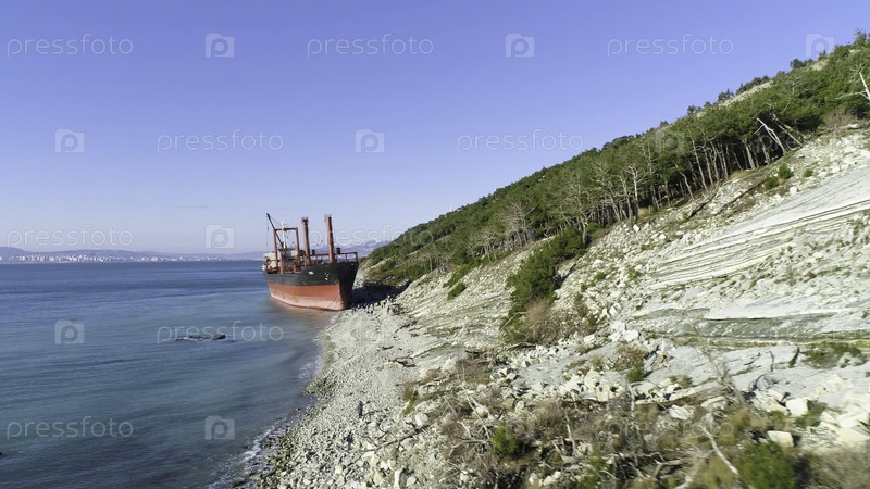 Знаменитый заброшенный кораблекрушение в море.Стреляйте.Вид на брошенное судно на пляже