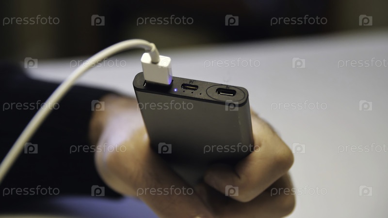Закройте руку, вставляя зарядное устройство с USB-кабелем в портативный банк питания. СМИ. Покройте руку человека, вставив кабель в зарядку