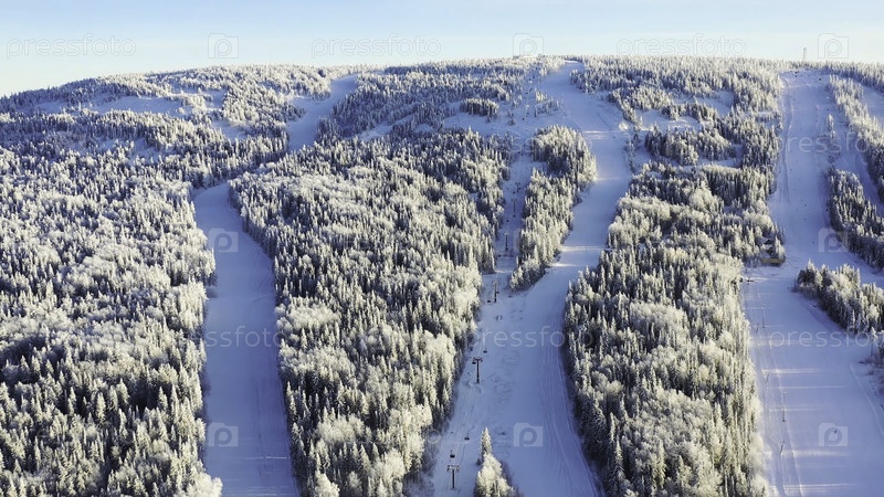 Вид на горнолыжные трассы с подъемниками. Кадр. Прекрасный вид на заснеженные склоны гор с хвойным лесом и лыжными ходами в зимнем курорте