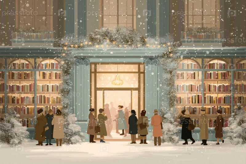 Зимняя сцена с разнообразной группой людей снаружи уютного книжного магазина во время снега