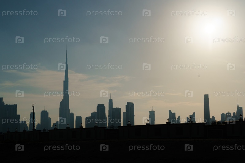 Архитектура Дубая, мегаполиса на закате. сверхвысокий небоскреб в Дубае, Объединенные Арабские Эмираты
