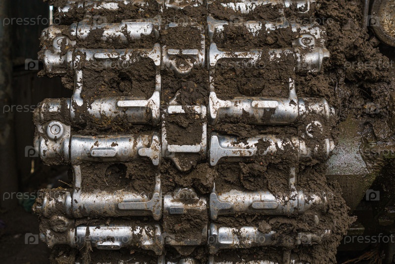 Танк гусеницы в грязи, военная техника на близком расстоянии