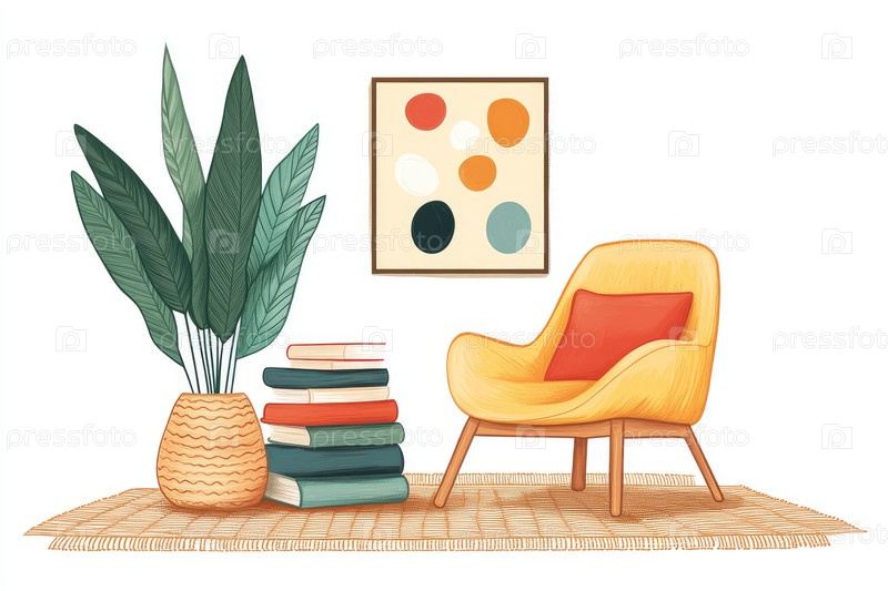 Минималистская иллюстрация уютного интерьера со стулом, стопкой книг, комнатным растением и украшением стен, скандинавской концепцией дизайна дома