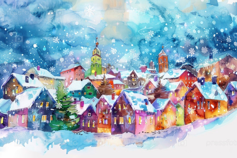 Красочная зимняя деревня со снегом и огнями