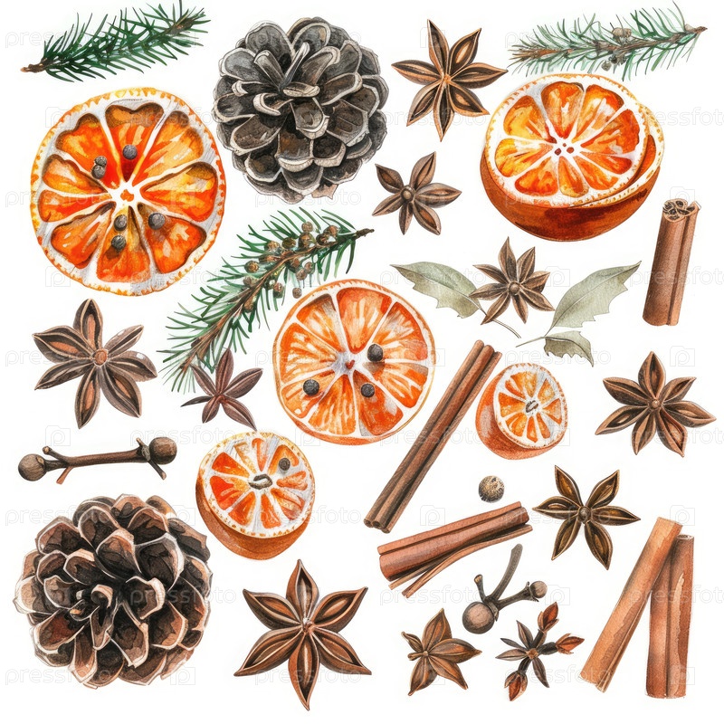 Коллекция акварельных элементов праздника с палочками корицы, соснами, звездным анисом, апельсинами и ветвями пихты, идеально подходит для рождественских ремесел, карт и упаковки