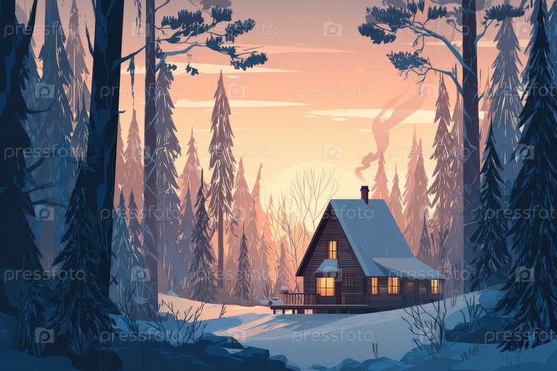 Уютный деревянный домик в снежном лесу во время заката с теплым светом, сияющим из окон