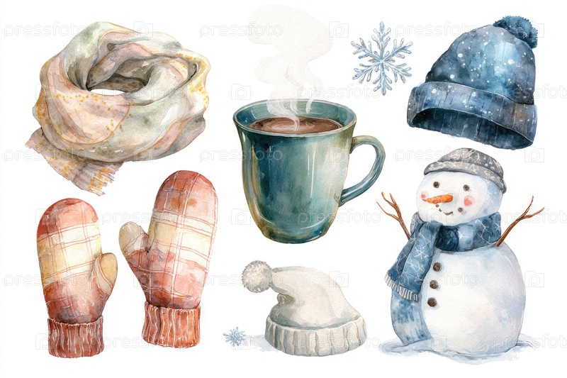 Коллекция зимних аксессуаров с уютным шарфом, рукавами, теплой шляпой, поднимающейся кружкой и иллюстрацией снеговика