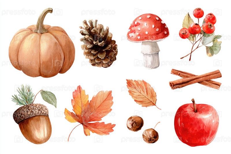 Осенний акварель с тыквой и желюдьми
