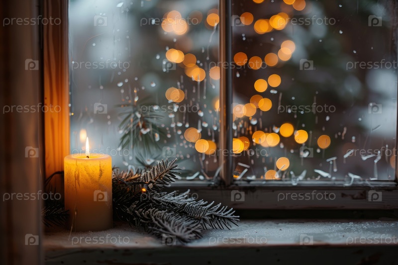 Уютная фотография рождественской свечи на подоконнике с снегом, сосновыми ветвями и светящимся боке.Теплое зимнее праздничное настроение для сезонного дизайна и поздравительных открыток