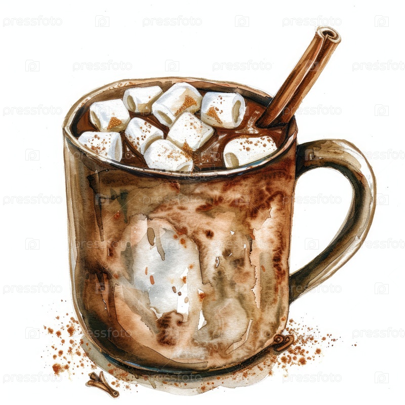 Уютная акварельная иллюстрация горячего шоколада в деревенской коричневой кружке с зефиром и палочкой из корицы.Идеально подходит для зимних, досуговых, кафе, кухни или праздничных тематических дизайнов