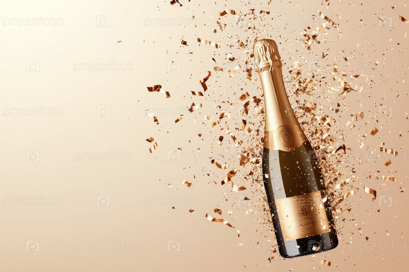 Бутылка шампанского с золотым взрывом конфетти