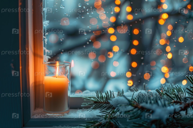 Уютная зимняя свеча на морозном окне с теплыми огнями