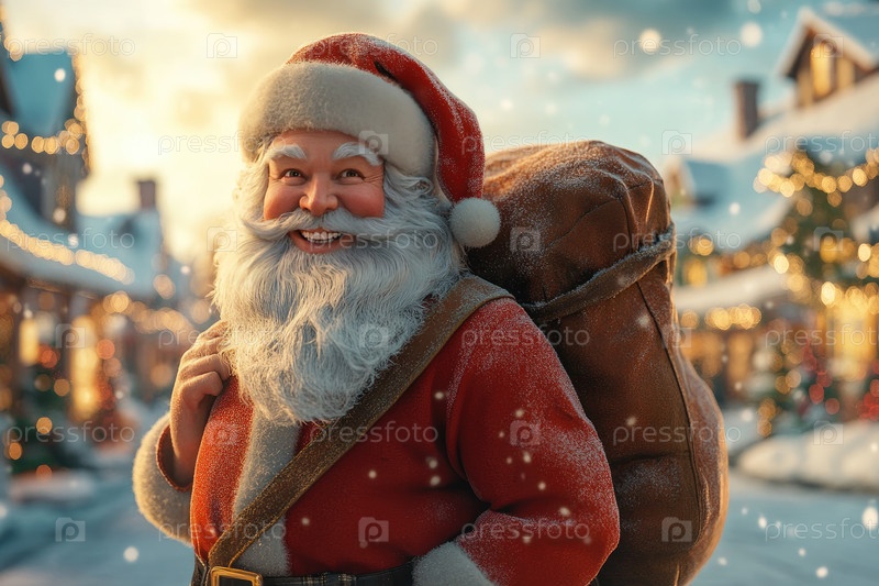 Санта Клаус с большим пакетом подарков на снежной рождественской улице