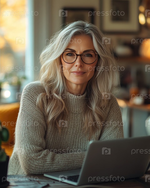 Уверенная в себе, зрелая женщина с седыми волосами работает на ноутбуке внутри дома