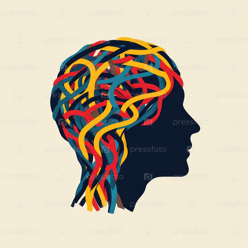 Художественный абстрактный силуэт человеческой головы с красочными запутанными линиями, символизирующими мысли, творчество и сложный ум