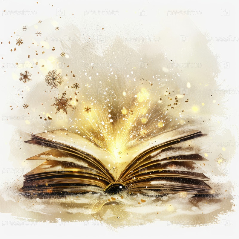 Фантастическая иллюстрация волшебной книги с золотым светящимся светом, снежинками и гребешками. Идеально подходит для праздничных тем, фэнтези-постеров и визуальных эффектов