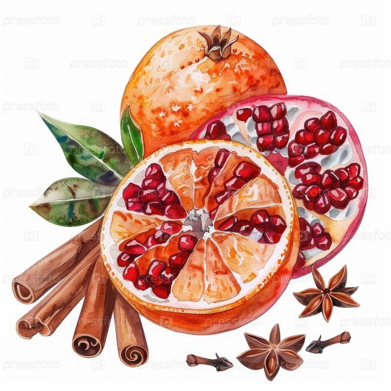Акварельные фрукты и специи с апельсином и гранатом