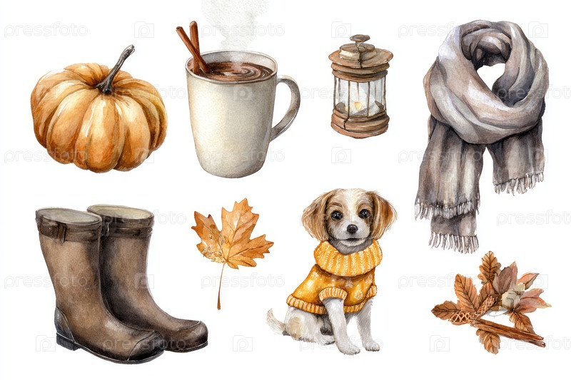 Акварельная иллюстрация с уютными осенними элементами, такими как тыквенка, теплая чашка кофе, милая собака в свитере и резиновых сапогах создает тёплую и привлекательную сезонную атмосферу