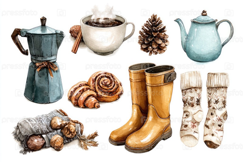 В этом уютном зимнем натюрморте есть кофейная кастрюля, чашка с парной водой, выпечка и теплые аксессуары, такие как сапоги и носки, создавая уютную атмосферу, идеально подходящую для сезона