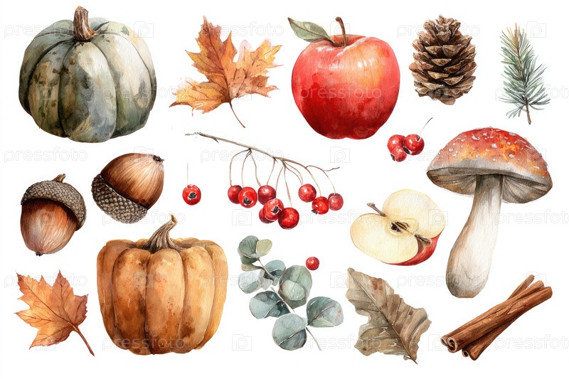 Яркая иллюстрация осеннего урожая, показывающая различные тыквы, красочные листья, красные яблоки и грибы, создавая сезонную атмосферу с достаточным пространством для копирования текста или элементов дизайна