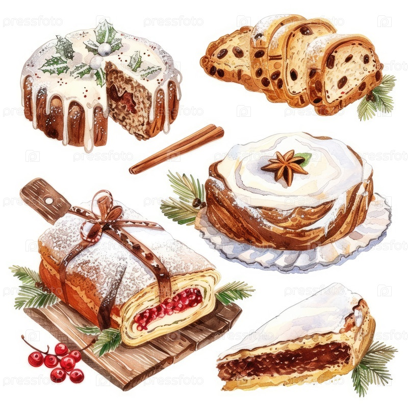 Иллюстрация праздничного десерта демонстрирует различные торты и выпечки, украшенные праздничными декорациями, текстурами и цветами, создавая теплую и приглашающую атмосферу для сезонных празднований