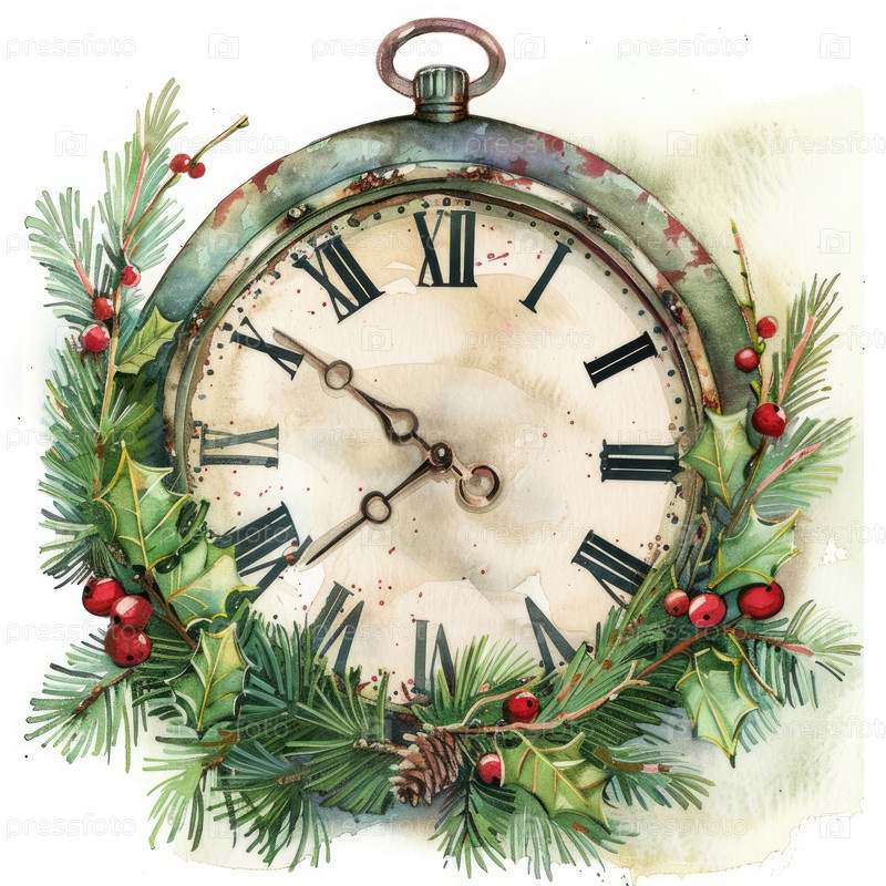 Винтажная иллюстрация часов с римскими цифрами, изящно окруженные пышными сосновыми ветвями, украшены ярко-красными ягодами, создавая теплую атмосферу праздника