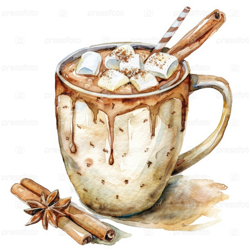Теплый какао-напиток подается в керамической кружке, покрытой пушистыми зефирами и палочками с корицей, создавая уютную атмосферу, идеально подходящую для зимних собраний и утешающих моментов