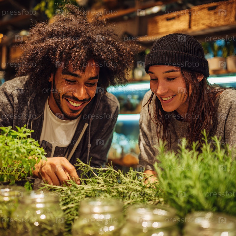 Афроамериканский мужчина и женщина с удовольствием организуют свежие травы в уютном городском саду, окруженном зеленью и консервными банками, создавая яркую и приглашающую атмосферу