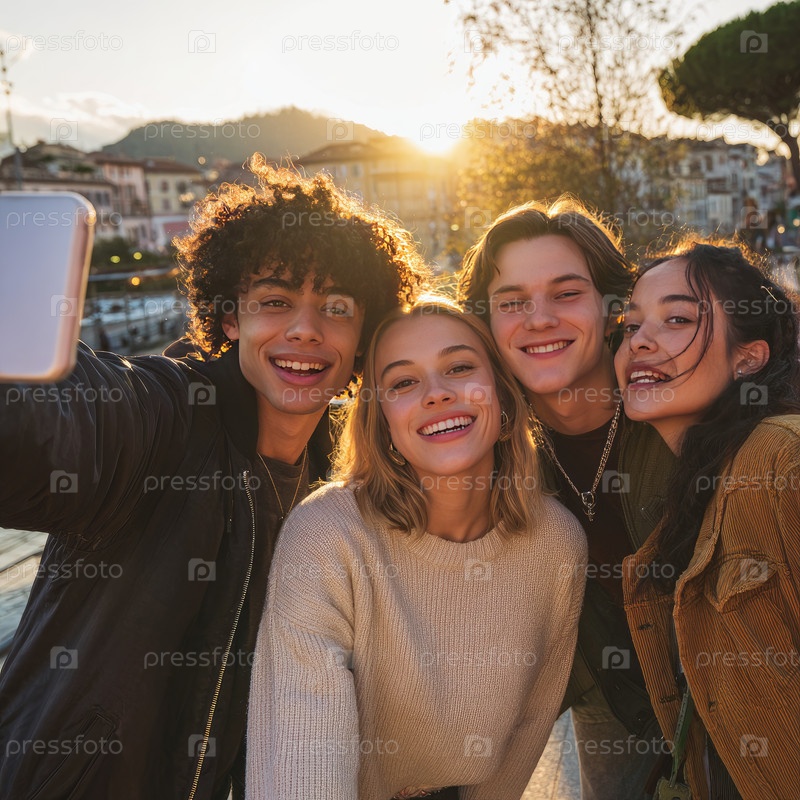 Группа молодых друзей счастливо делают селфи на свежем воздухе во время заката, в окружении яркого городского пейзажа, демонстрируя свое счастье и связь в теплой привлекательной атмосфере