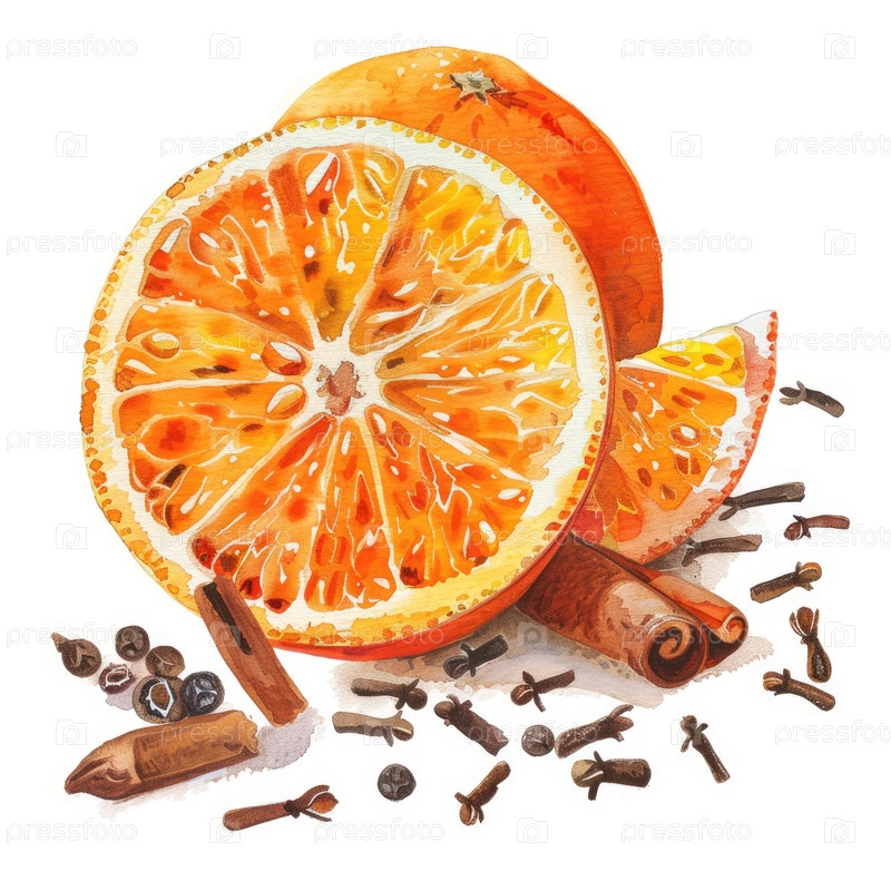 Илюстрация акварели с ярко-оранжевыми ломтиками рядом с ароматическими палочками и ногтями корицы, создавая теплую и привлекательную композицию с богатыми цветами и текстурами, идеально подходит для кулинарных тем
