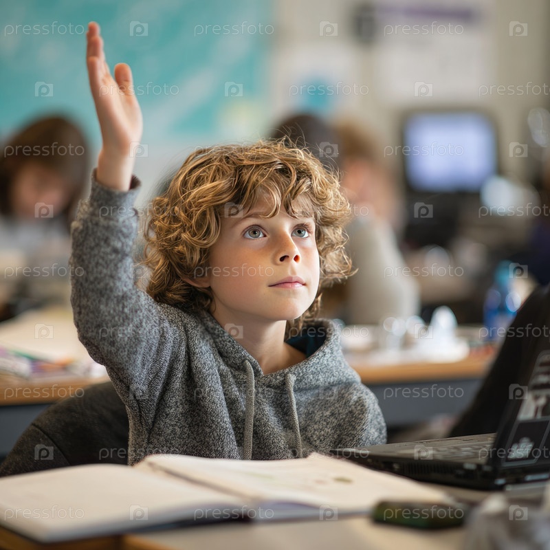 Молодой мальчик с кудрявыми волосами восторженно поднимает руку в классе, наполненном студентами, демонстрируя свое желание участвовать в процессе обучения и способствовать обсуждению