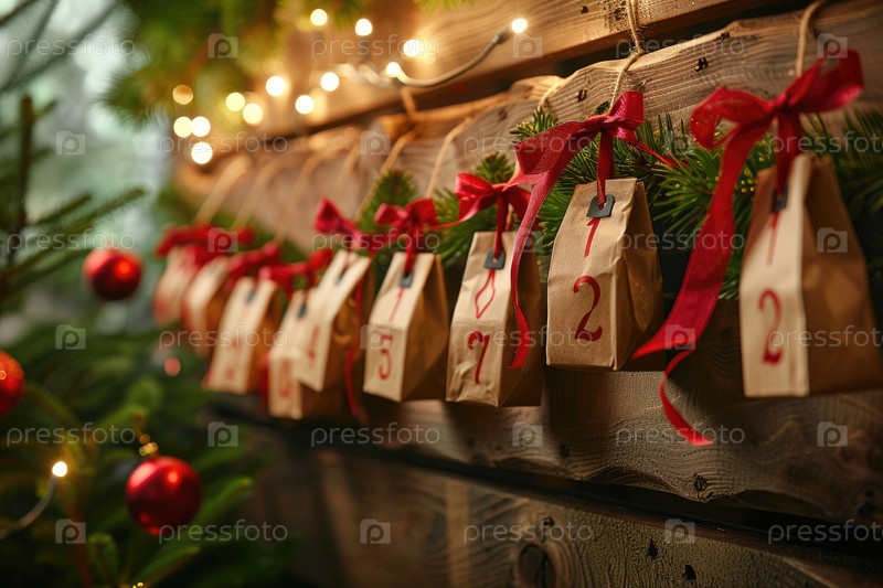 Календарь приключений с декоративными подарочными сумками с красными лентами, висящими на деревянной стене в окружении мерцающих огней и рождественской елки, создавая теплую праздничную атмосферу