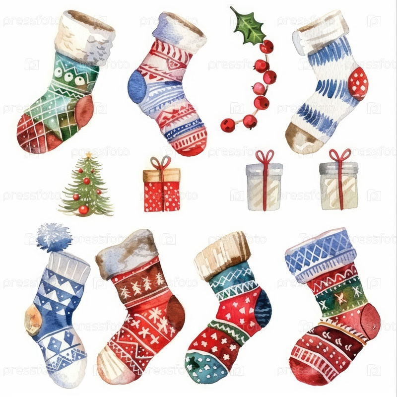 Эта яркая акварельная иллюстрация включает в себя многие праздничные рождественские чулки, красиво украшенные подарки, ягоды Холли и очаровательную Рождественскую елку, идеально подходящую для праздничных проектов