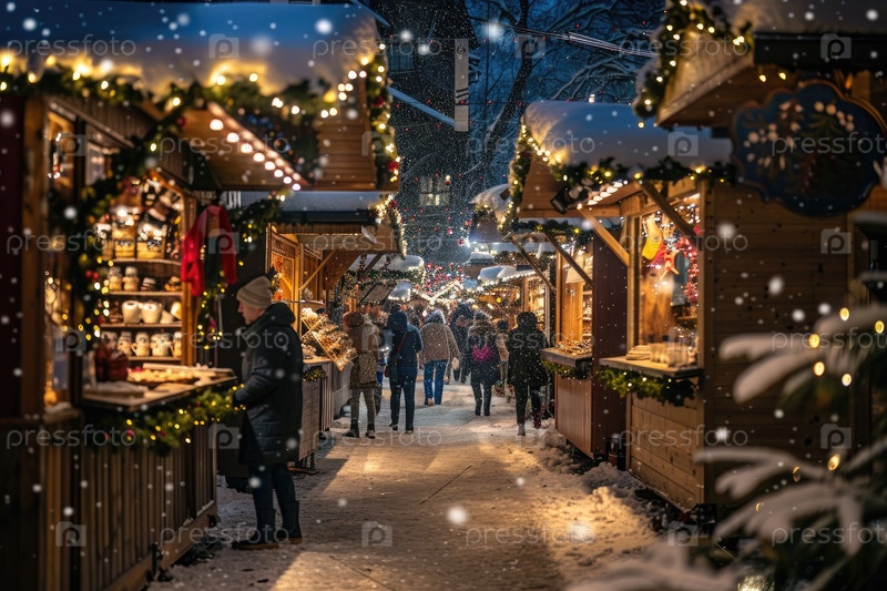 Зимняя рыночная сцена с очаровательными киосками, украшенными огнями, в окружении посетителей, наслаждающихся праздничной атмосферой, а снег медленно падает, создавая волшебный отдых