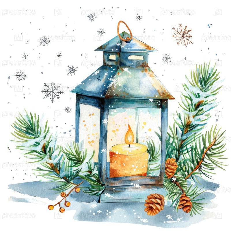 Фонарь с светящейся свечой окружен сосновыми ветвями и нежными снежинками в безмятежной зимней иллюстрации, создающей уютную и праздничную атмосферу для рождественского сезона
