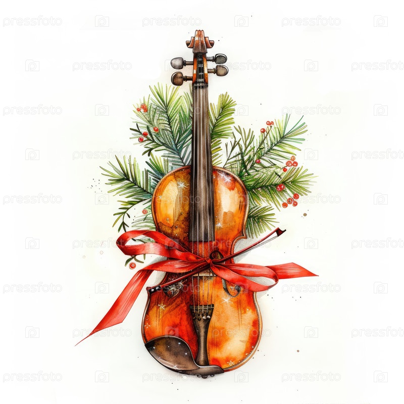 Красиво выполненная скрипка, украшенная ярко-красной лентой и окруженная пышными сосновыми ветвями, создает праздничную атмосферу, идеальную для зимних каникул и праздничного настроения