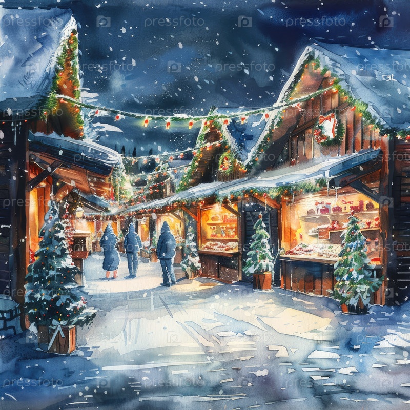 Зимняя рыночная сцена с красиво освещенными киосками в окружении заснеженных деревьев, где посетители гуляют по праздничной атмосфере, захватывая радость праздничного сезона