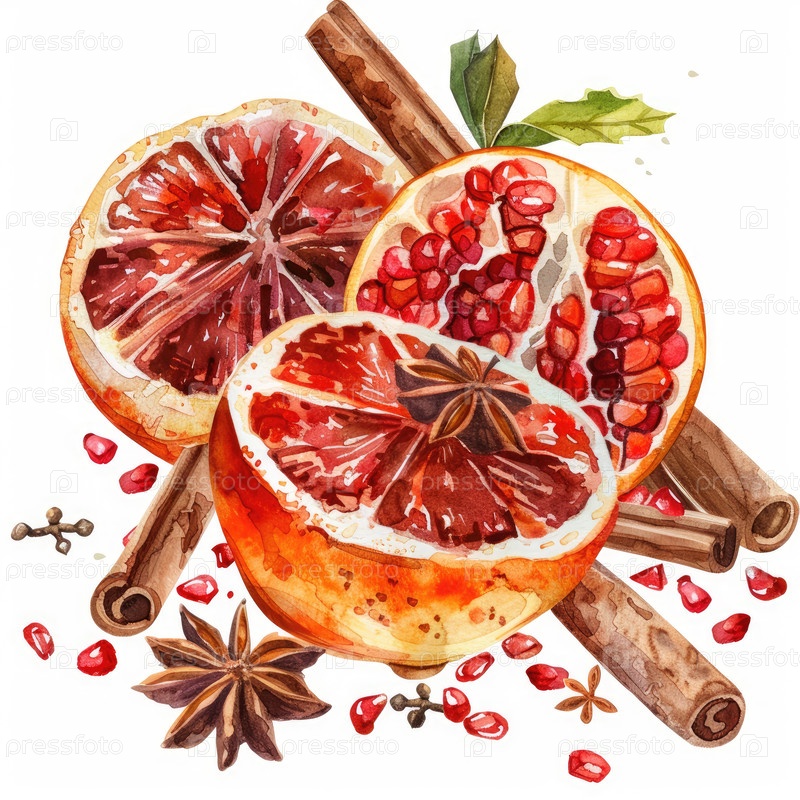 Акварельная иллюстрация с яркими кровяными апельсинами, сочными семенами граната и ароматическими специями, такими как корица и звездный анис, создавая визуально привлекательную композицию с богатыми цветами и текстурами