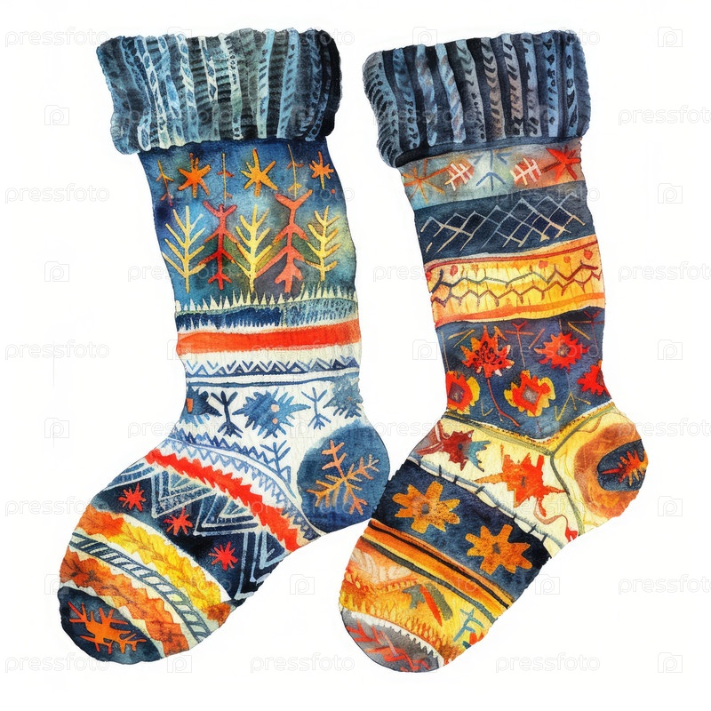 Цветовая иллюстрация рождественских чулков со сложными узорами и яркими цветами, показывающей смесь праздничных дизайнов, идеально подходит для праздничных проектов и украшений