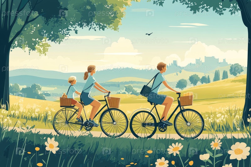 Семья из трех человек, включая ребенка, наслаждается спокойной поездкой на велосипеде по живописному пейзажу, заполненному пышной зеленью, цветущими цветами и безмятежной атмосферой, захватывая радостный опыт в открытом воздухе