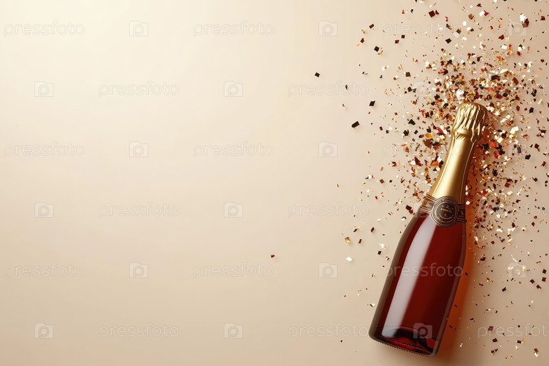Бутылка шампанского со золотой фольгой на мягком фоне с разноцветными конфетти, разбросанными вокруг