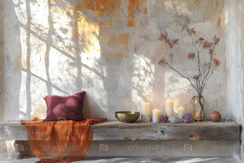 Минималистский интерьер со свечами, декоративными элементами и естественным освещением создает спокойную атмосферу